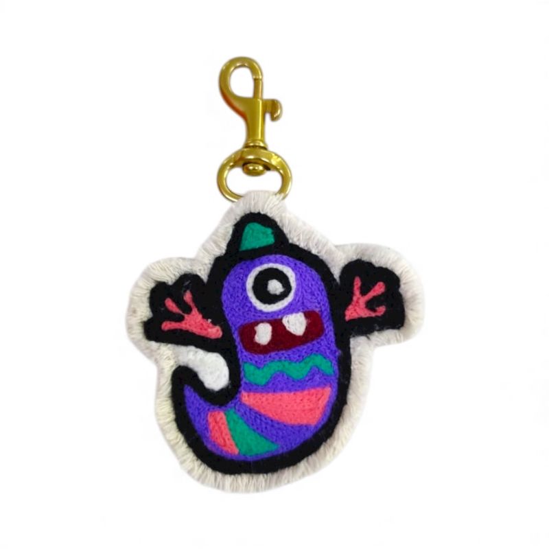Our fringed canvas chainstitch embroidered charms are made using an oldschool hand operated chainstitch embroidery machine technique. Due to the hand operated machine, no two charms are perfectly identical. Hang the charms on the loop by themselves on the handle or stack them one on top of the other. There is no limit on where you can hang these charms, they could also be key chains and much more.